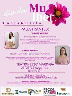 No mês dedicado à valorização e reconhecimento das mulheres, tivemos a honra de no dia 23 de março de 2026, realizar, no Teatro SESC Maringá, um evento especial voltado às mulheres contabilistas, em parceria com o SESCAP; CRCPR Mulher; Nucleo de Contadores da ACIM.